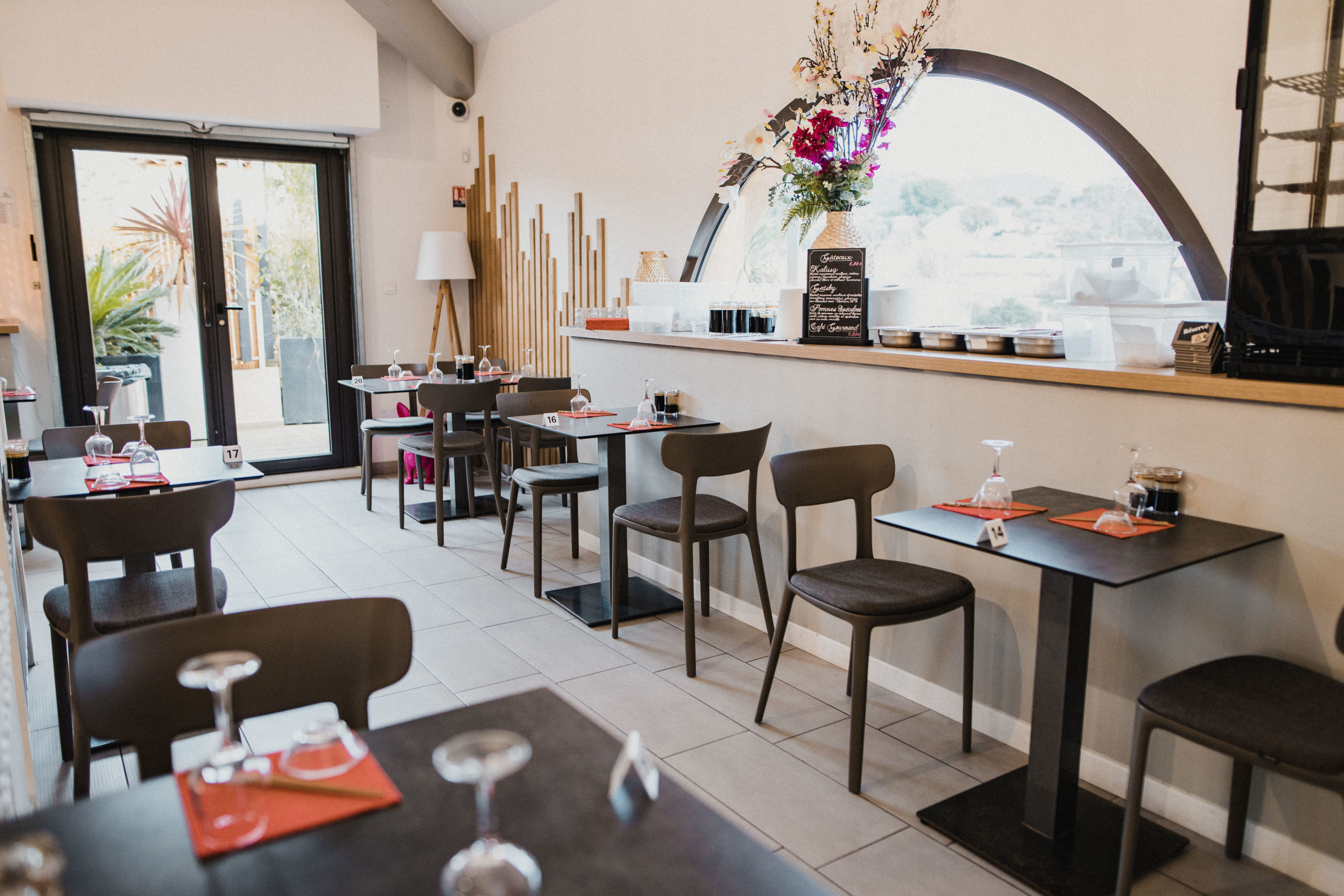 Restaurant, cuisine professionnelle ouverte.
